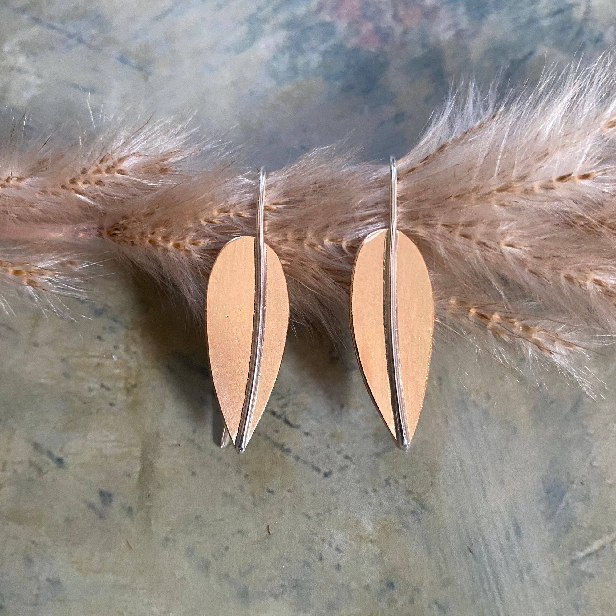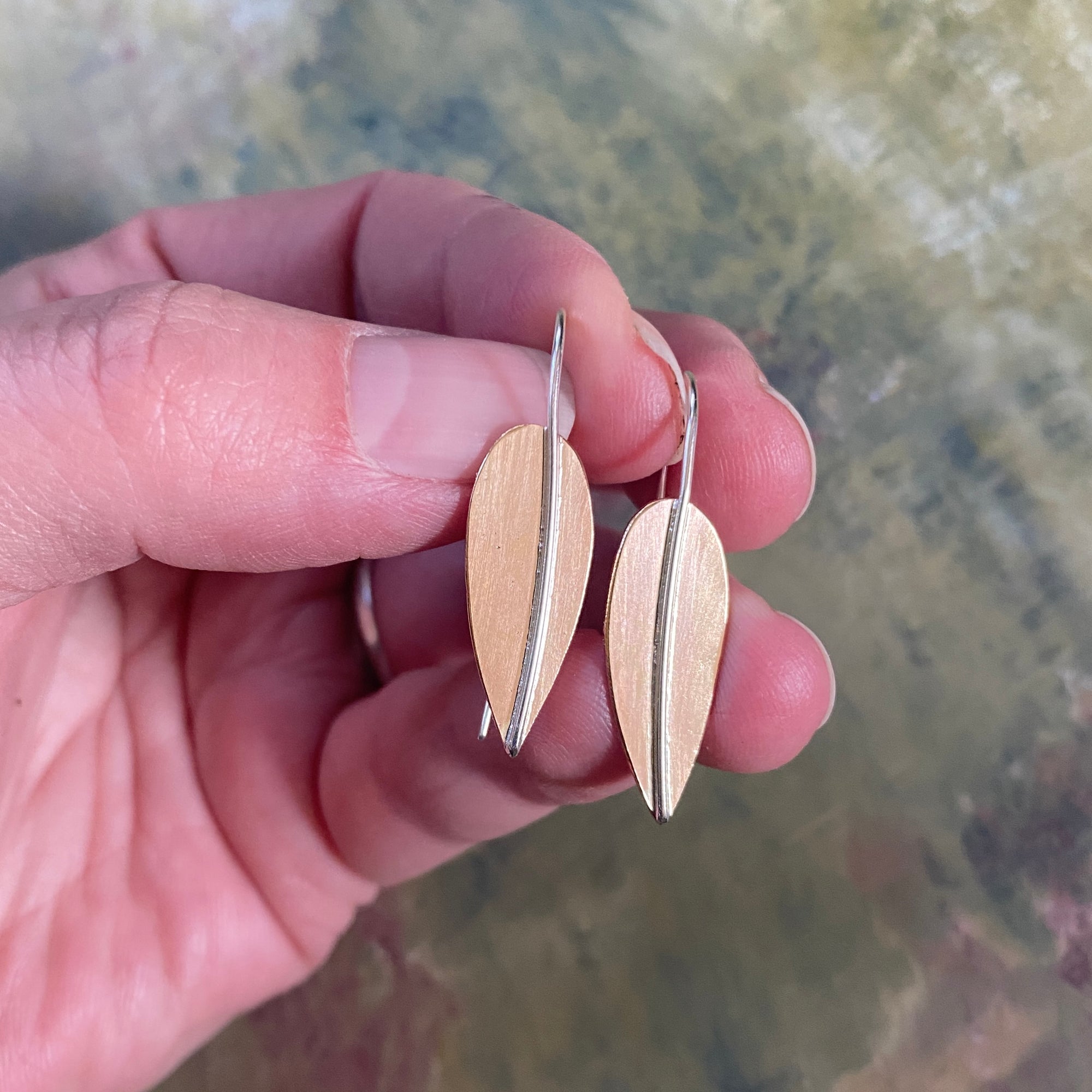 The leaves are hand cut out of Rose Gold Fill. The center stem of the leaf that leads into the earwire is made out of sterling silver. The metal has been given a slight brushed look to give a slight texture to the leaves. These earrings are just over an inch in length.