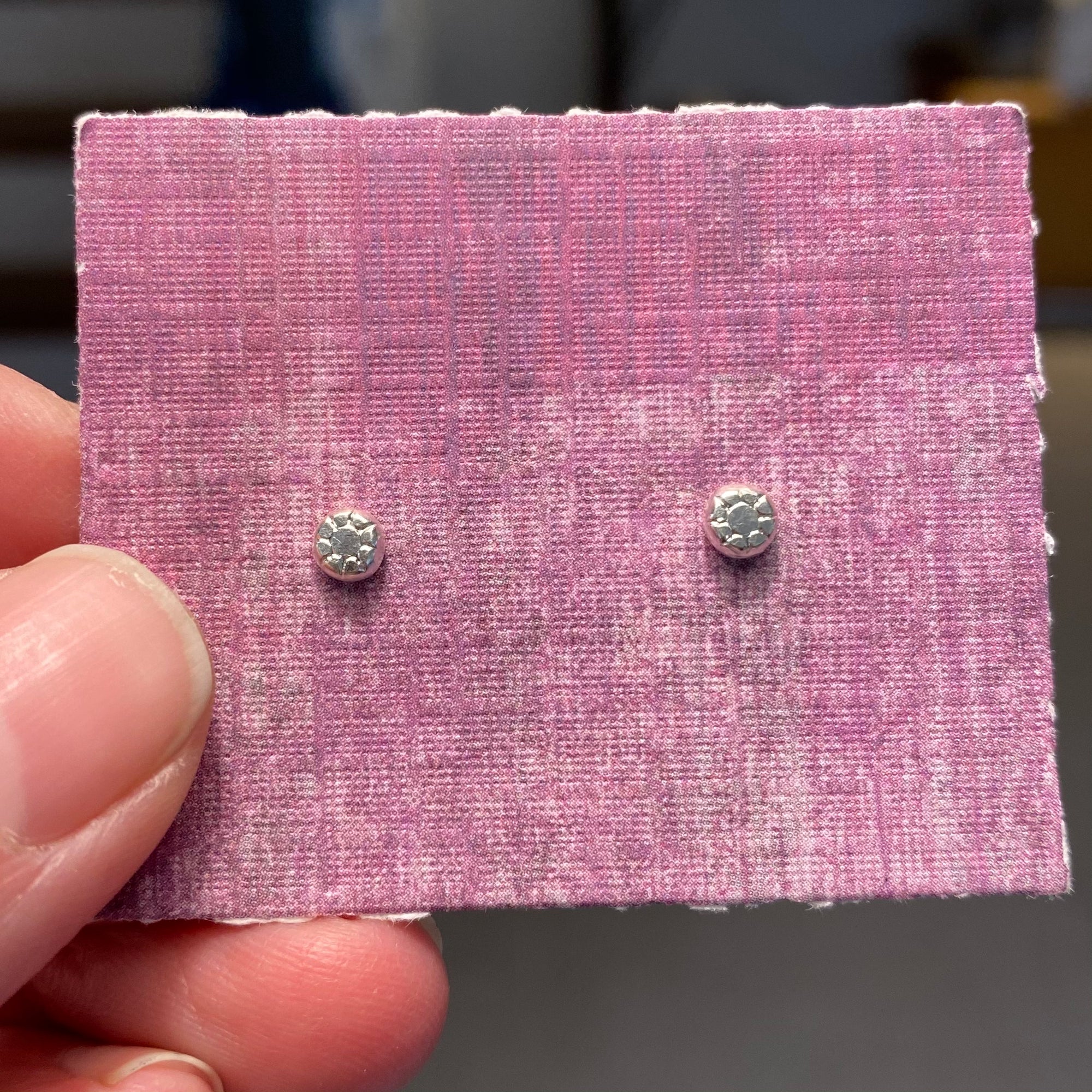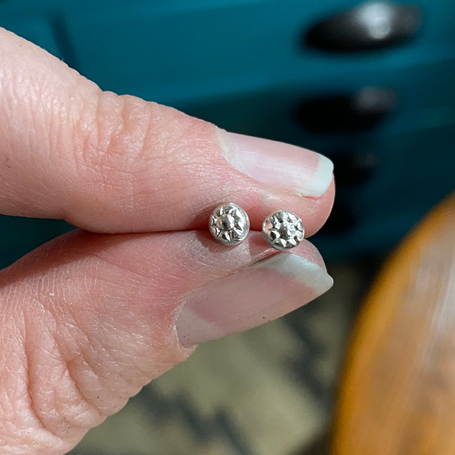 Small, sterling silver nuggets in sterling silver with small daisy imprints on the face. Earpost & earnut are sterling silver. No base metal for your precious ears! ;)