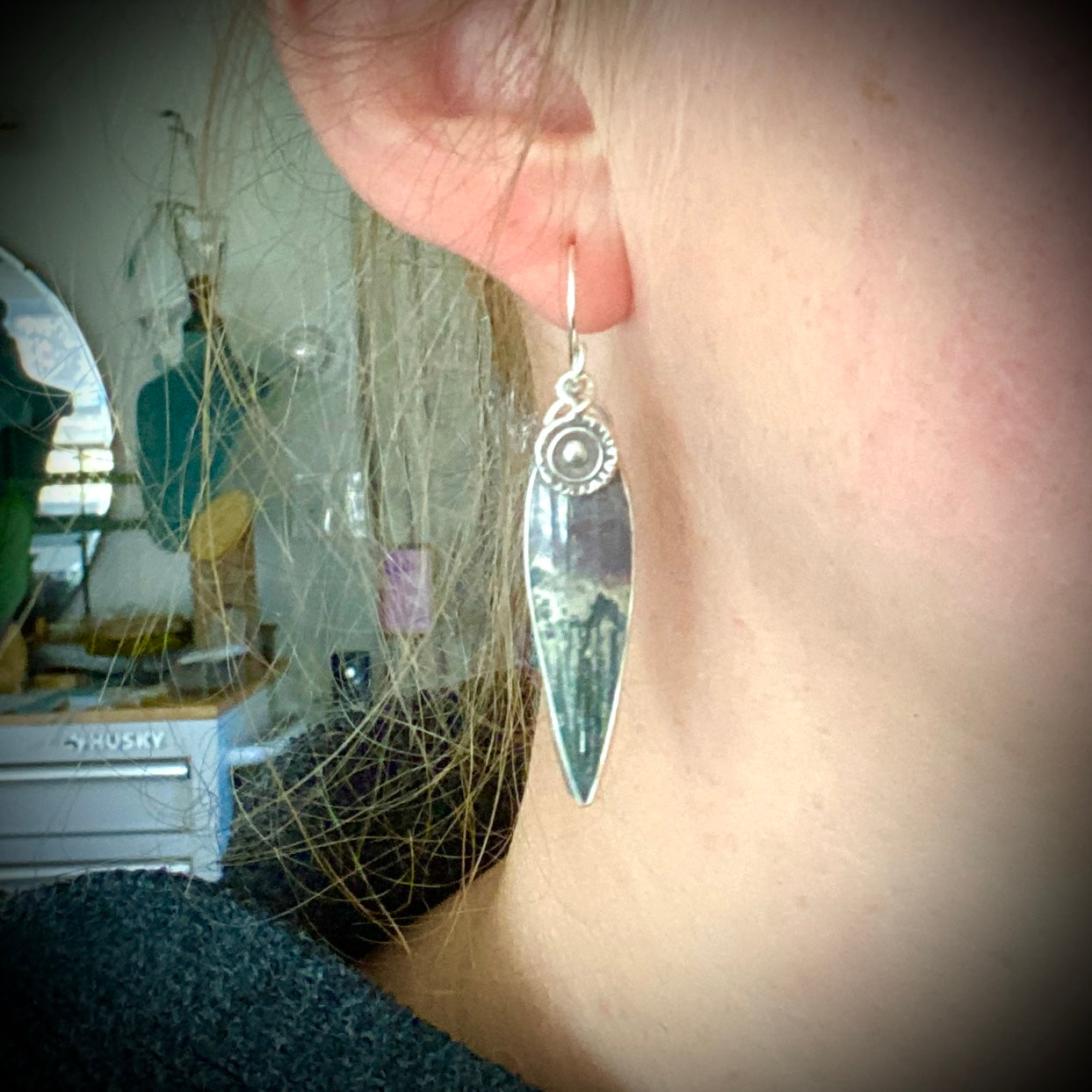 I hike a lot, and often times into the last light of the day. Things can look quite eerie, the land that you walk on and look upon turns dark and details fade, where the sky can turn an unusual shade of purple. If you are lucky, the moon might begin to rise to light your way. This feeling is the inspiration behind these earrings.