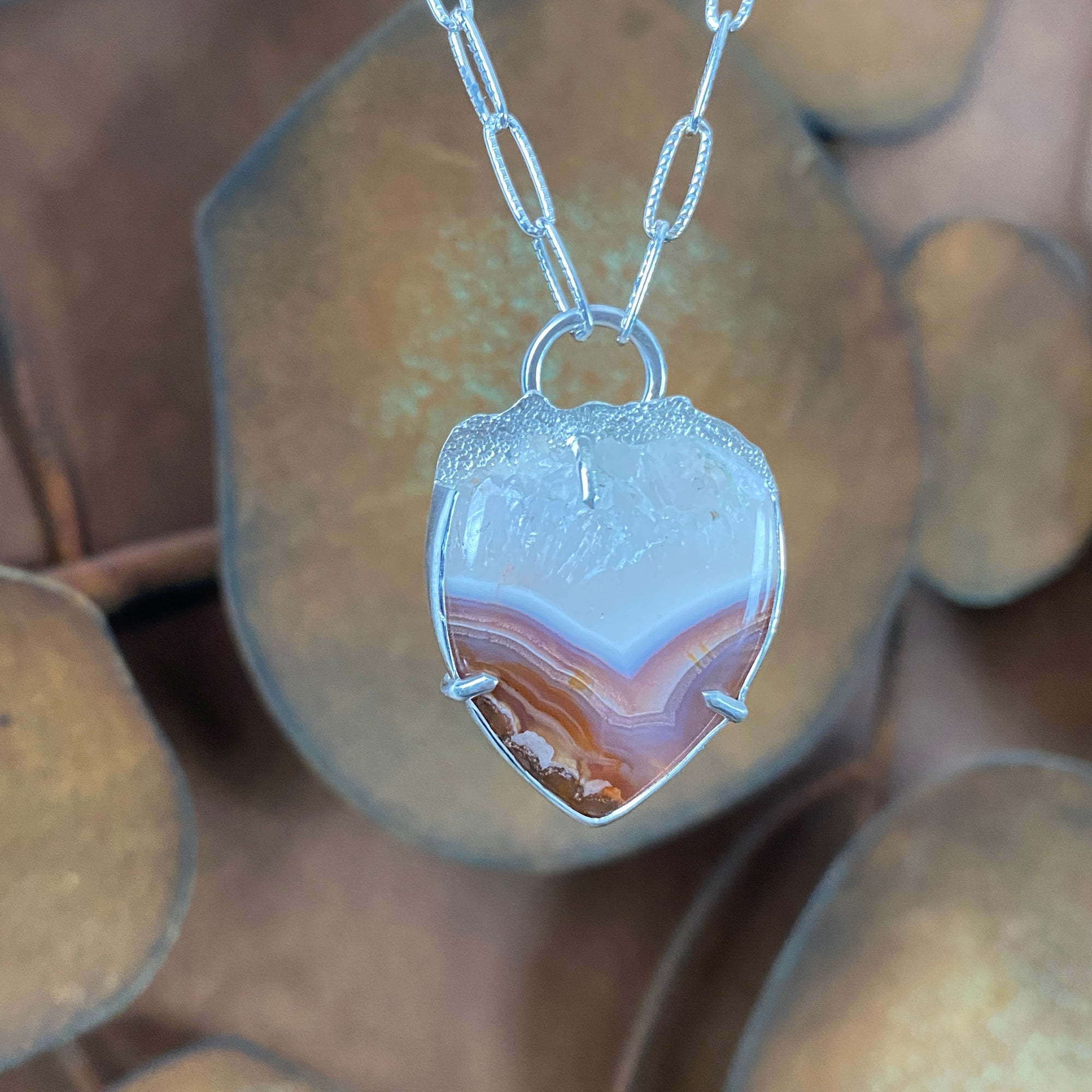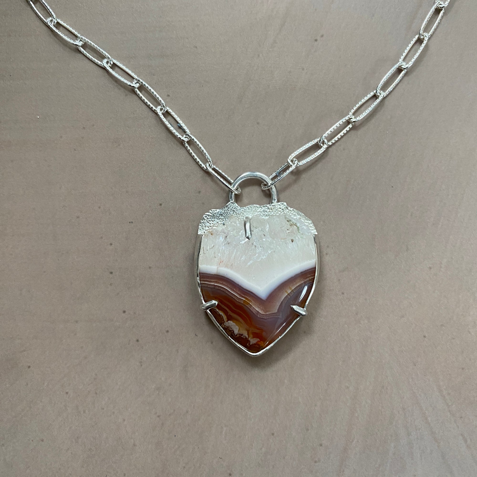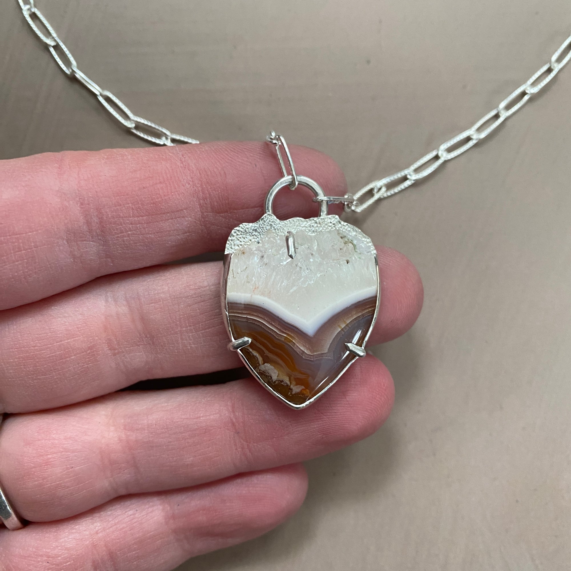 This necklace feels like an appropriate one to write about today. The inspiration behind this piece is how important snow is to the ground below! Even though we cannot see it, the moisture will eventually penetrate into the ground to help our grass grow, our trees build big roots and encourage our flowers to bloom. So in the depth of winter, I like to think about what the snow will encourage once the temperatures change and spring is upon us. This Druzy agate is such a cool stone! I have had it in my collection for quite some time and knew I needed a really unique way to set it. At the top of the stone is a sparkly quartz druzy and towards the bottom of the stone is the gorgeous banding that happens with Agate. The top of the stone is bright white and the bottom agate is in shades of burnt orange, terracotta, peach and merlot. The stone has been set in sterling silver. A slight texture and cut has been placed above the stone to mimic the druzy sparkle at the crown. The stone is held in place by a 3/4 bezel and 3 prongs. The pendant is attached to 18" of sterling silver, textured, paperclip chain. The clasp is a lobster clasp at the back.