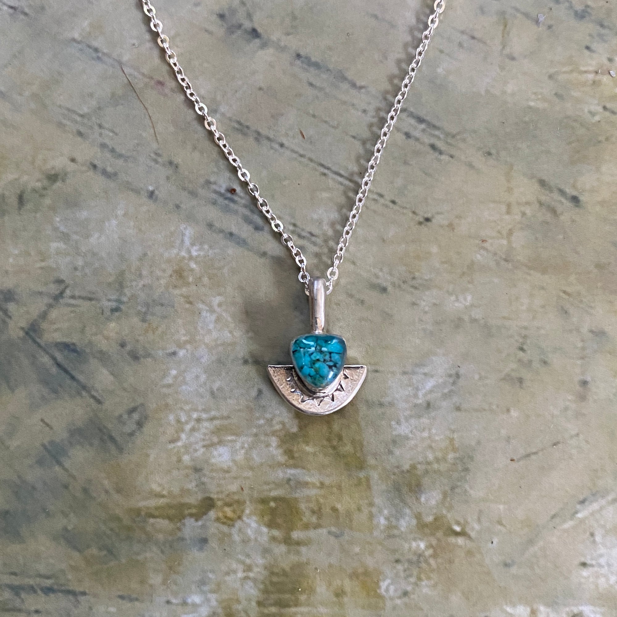 The Royston Turquoise is set in sterling silver and has a little accent apron with a stylized wave pattern. The pedant is approximately 1/2" in length. It is strung on an 18" chain with a lobster clasp.