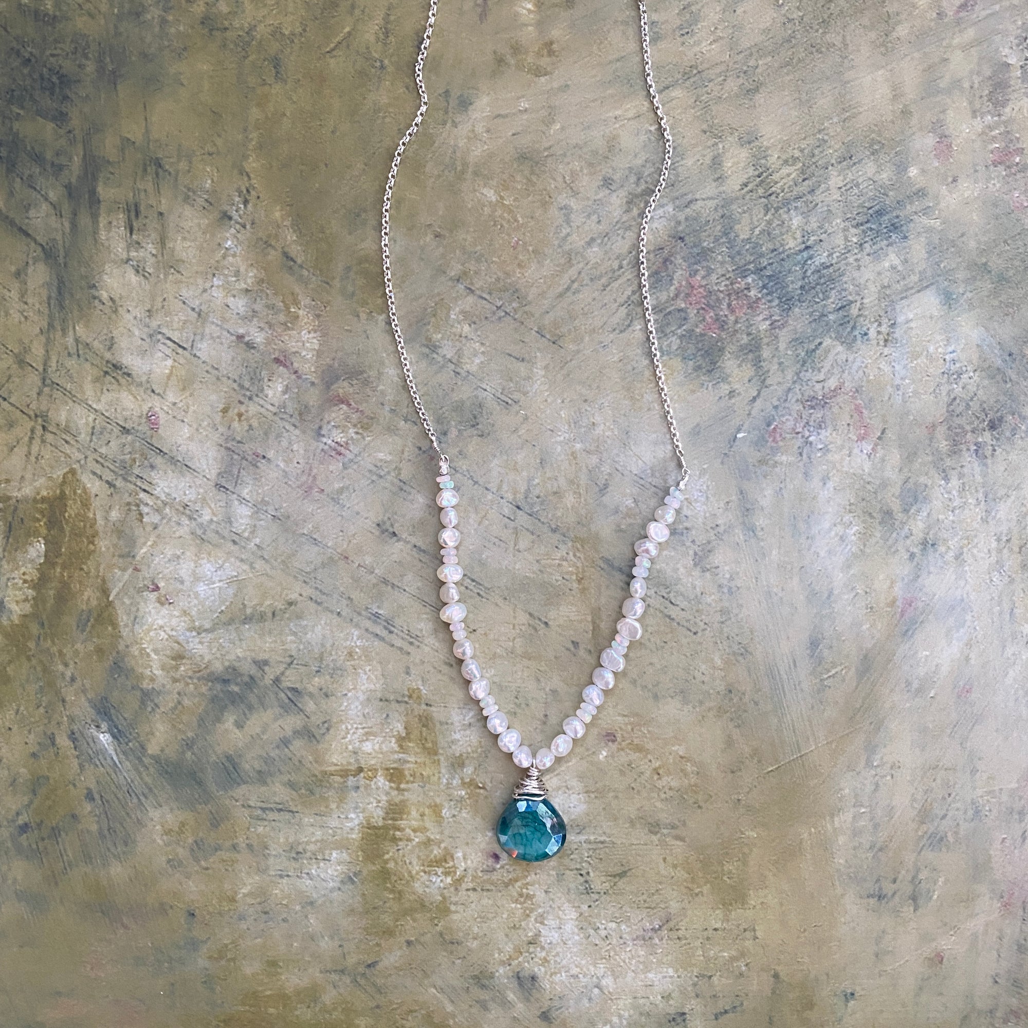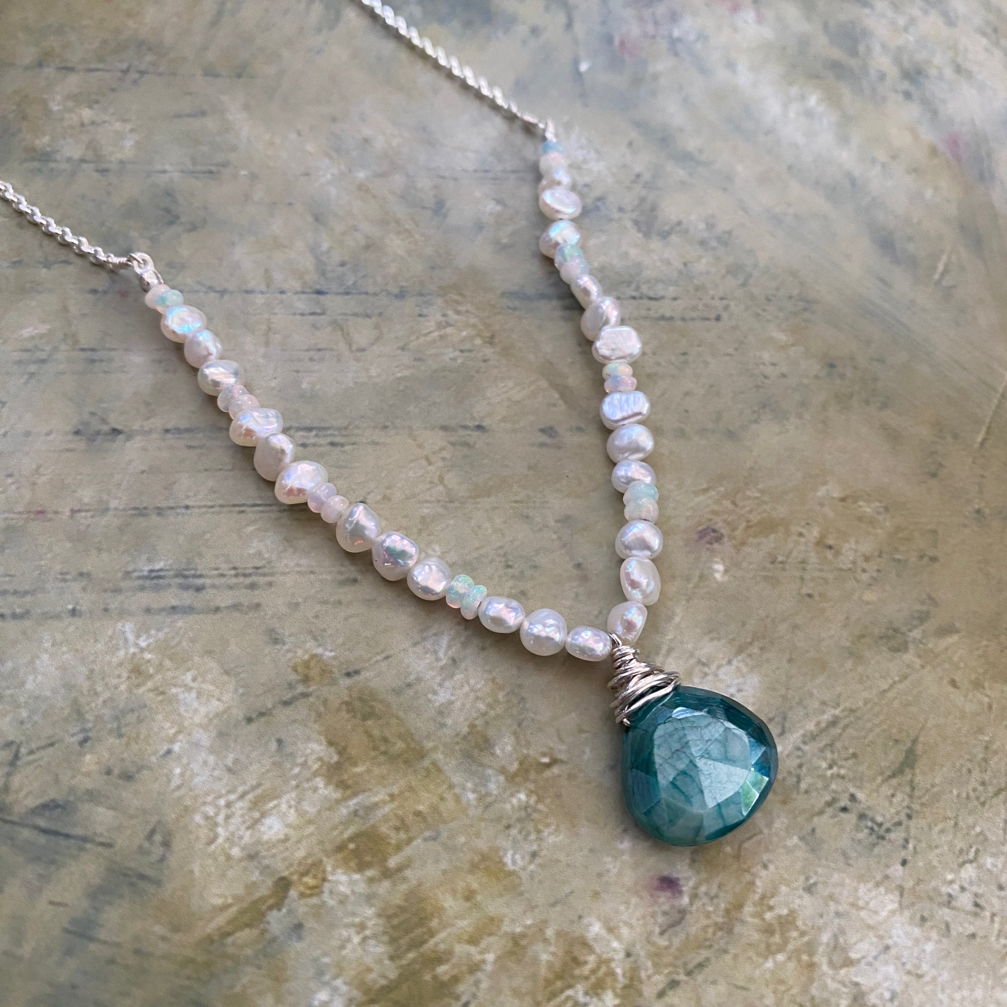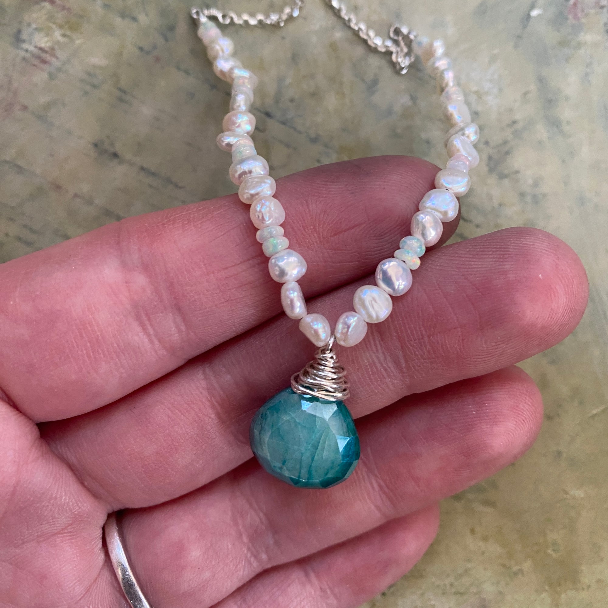 The Moonstone has been flanked with Freshwater Pearls and Ethiopian Opals. The Opals flash bright yellow, green, magenta and indigo. They have all been strung on sturdy silk cord. It has then been finished with sterling silver rolo chain. 18" in length. Lobster clasp closure.