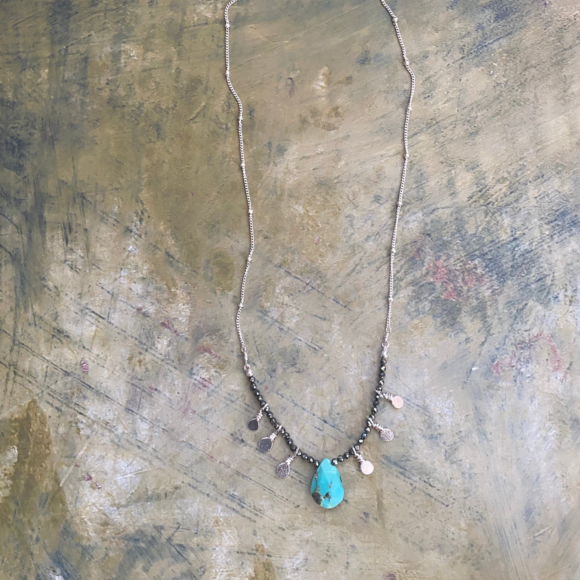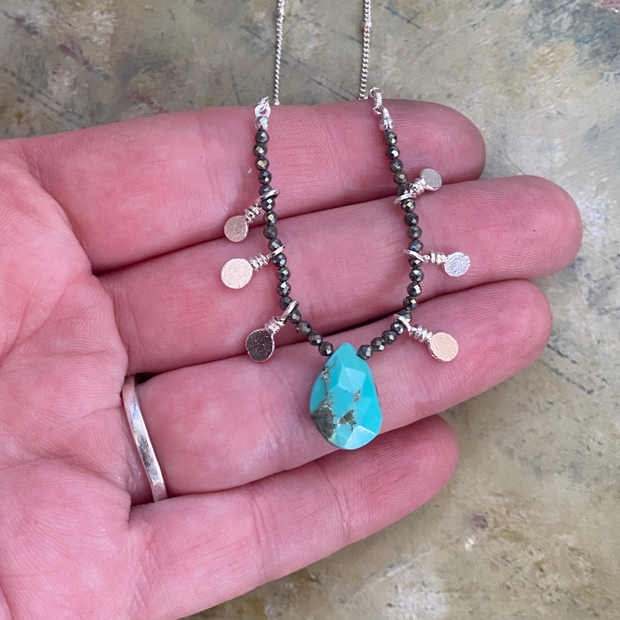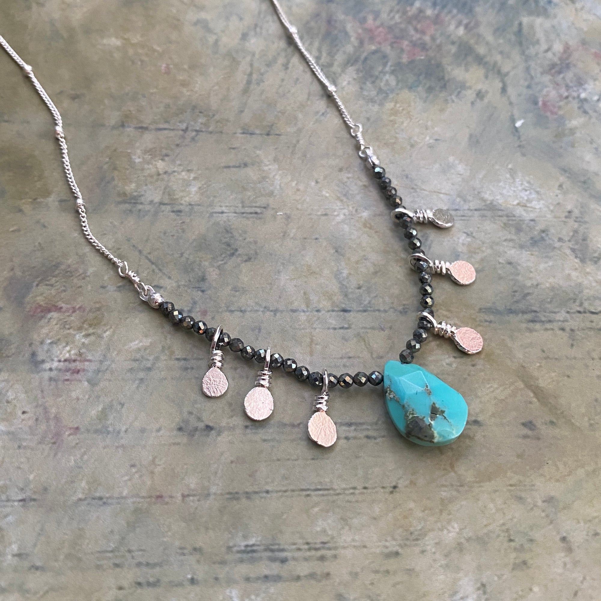 Sleeping Beauty Turquoise is a prized American Turquoise, known for its vibrant blues and few inclusions. This piece of Turquoise does have a few inclusions, but the inclusions pair perfectly with the Iron Pyrite gemstones that flank it. The beads are strung on sturdy silk cord and accented with a handful of handmade nugget charms. It is then finished with sterling silver bead chain. 17" in length. Lobster clasp closure.