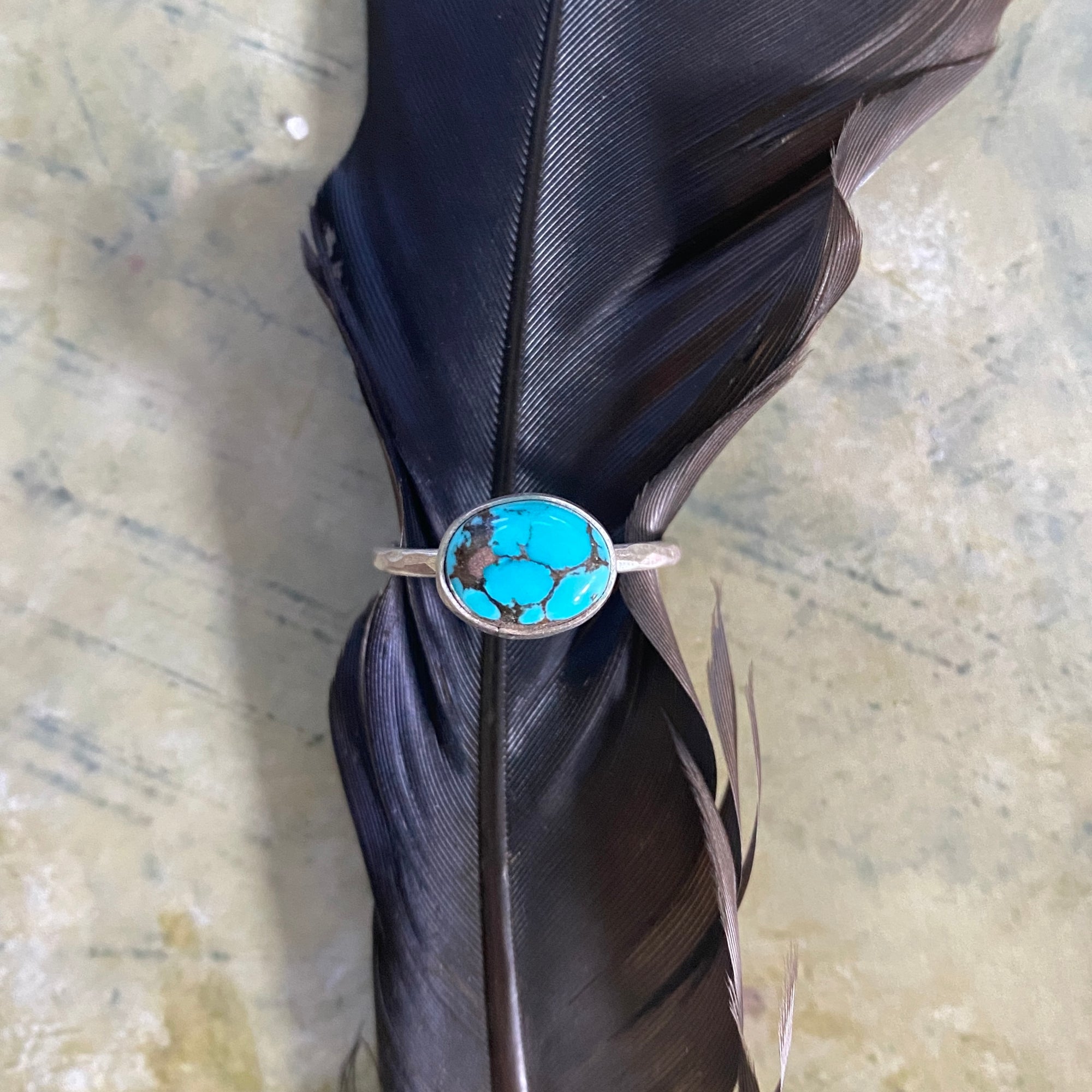 This piece of Egyptian Turquoise is a vibrant shade of teal with black inclusions. It is an organic oval shape, polished smooth. The Turquoise has been set in a smooth, sterling silver bezel and perched on a hammered ring band.