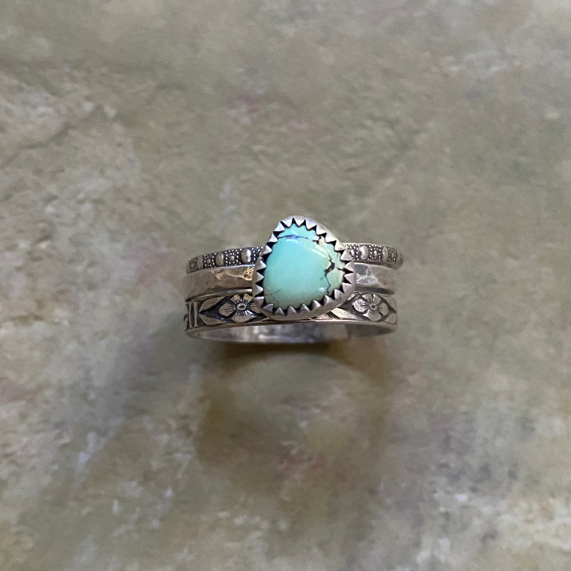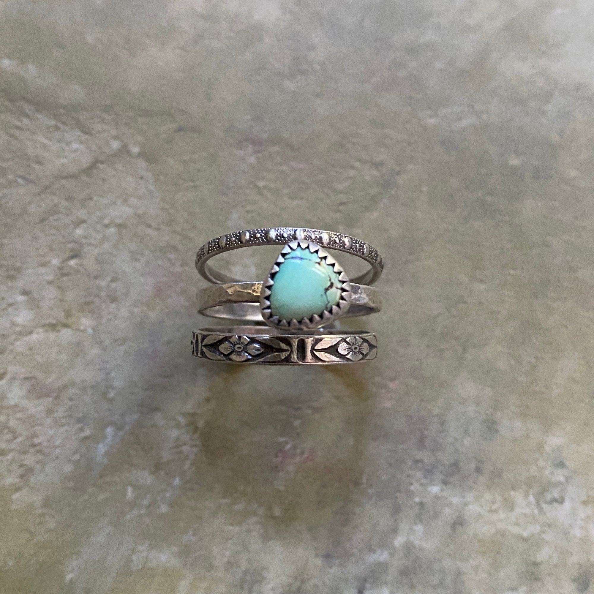 This beautiful piece of Blue Moon Turquoise has been shaped into a smooth triangle. It has been set in sterling silver and perched, askew, atop a hammered ring band. This stacking ring set consists of 3 ring bands: