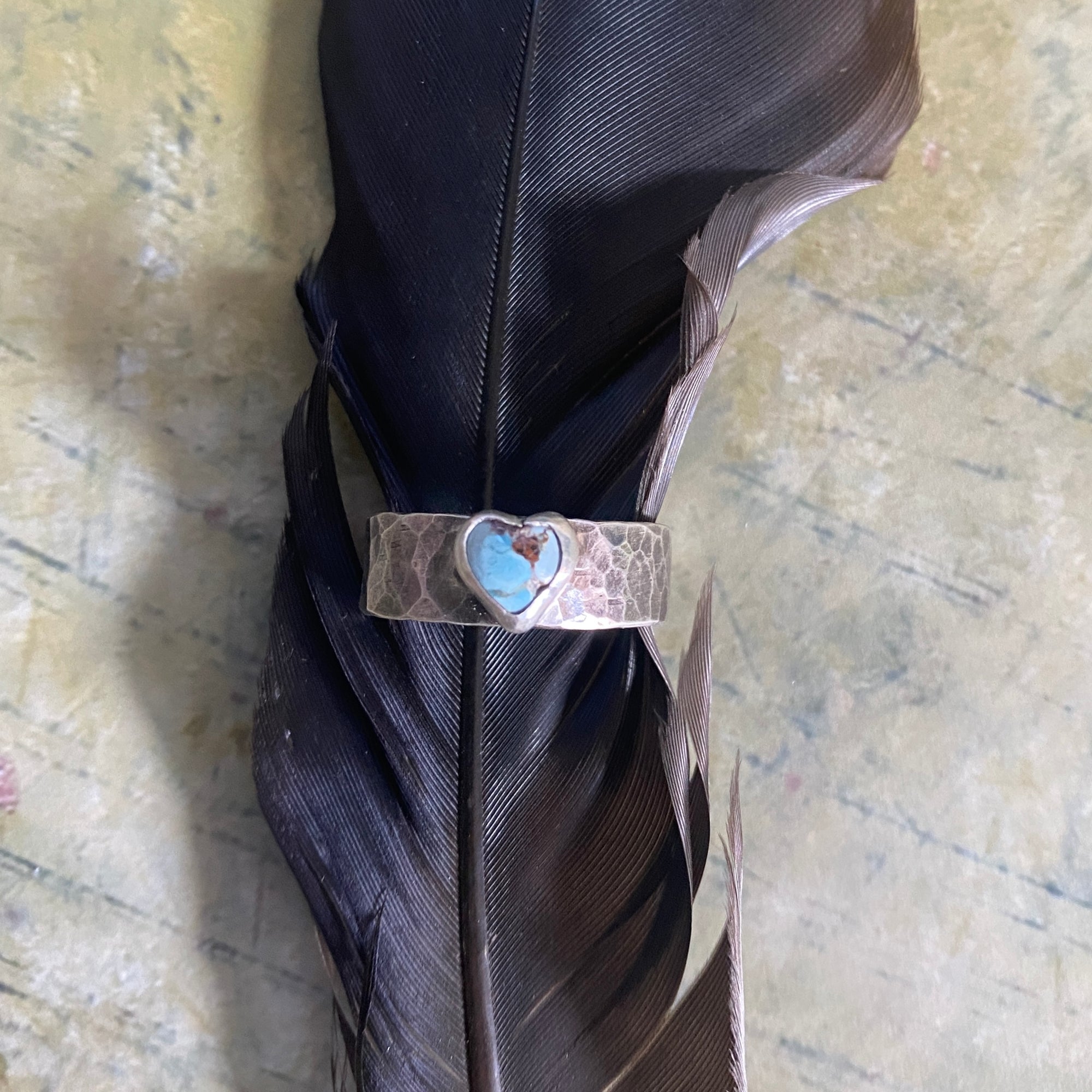 Lavender Hills Turquoise is one of the most distinguishable types of the stone, due to its pale purple-blue shade. This piece has been formed into a heart, and has deep brown inclusions within. The Turquoise has been set in sterling silver and perched on a thick, hammered ring band.