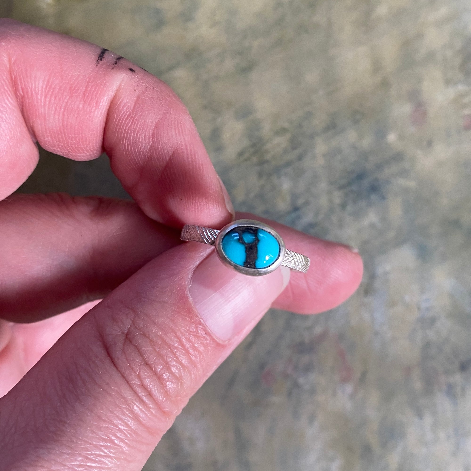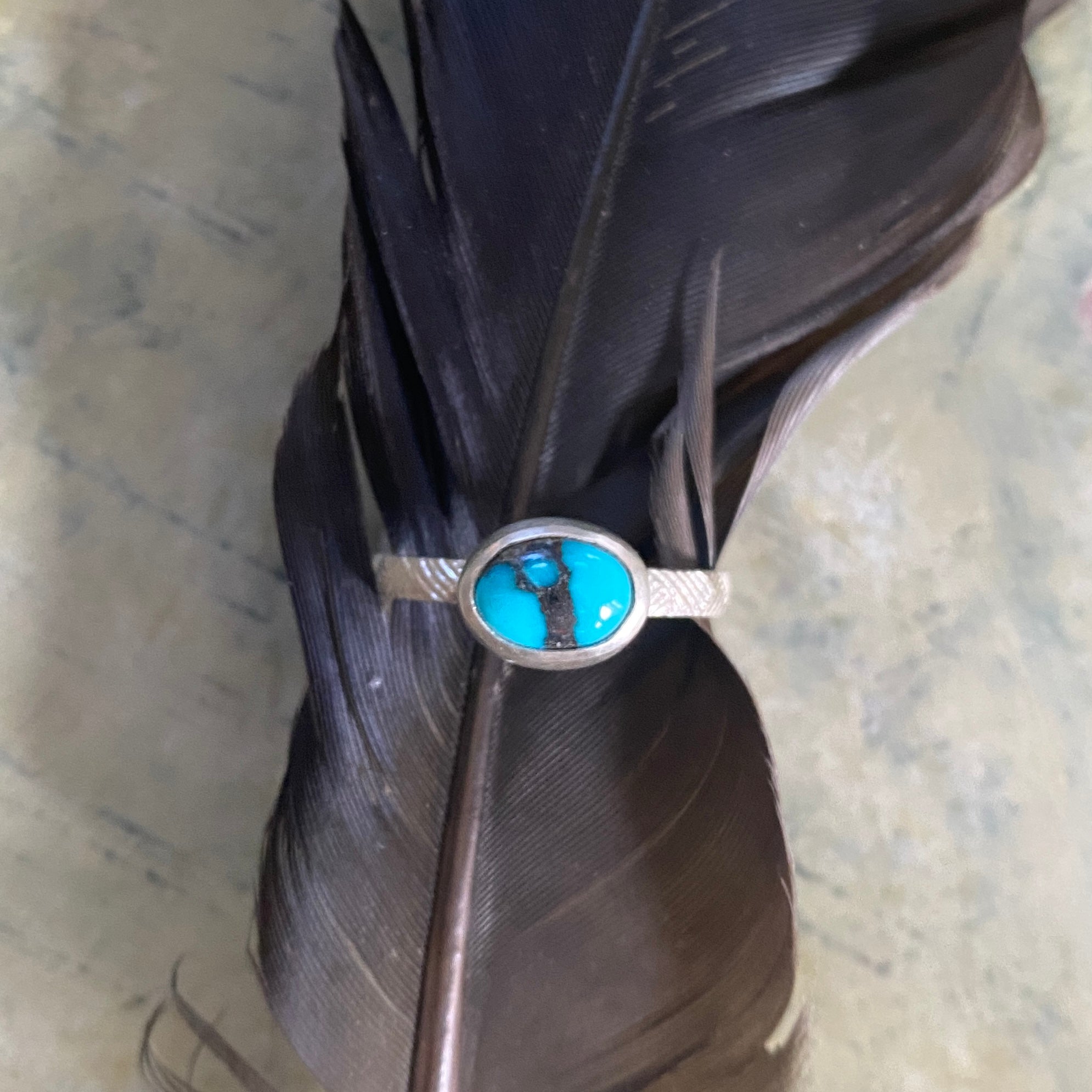Sweetgrass is a sacred grass found in the Southwest. When braided, it looks quite similar to the pattern on our Sweetgrass Band, so this is how the name of this ring was born! The bright silver band is topped with a teal blue and black, Egyptian Turquoise cabochon. The gemstone has one-of-a-kind inclusions throughout, making it a truly one-of-a-kind piece.