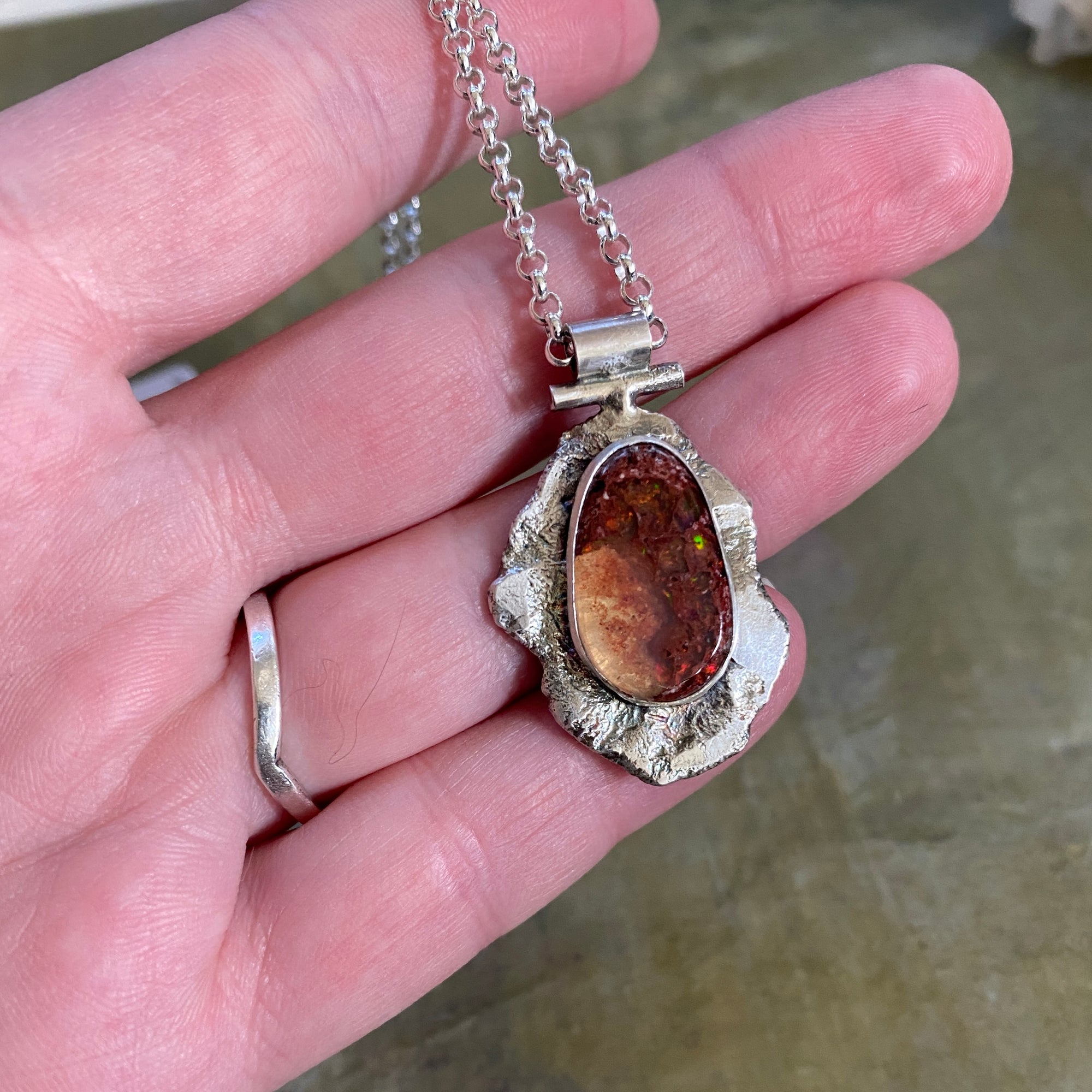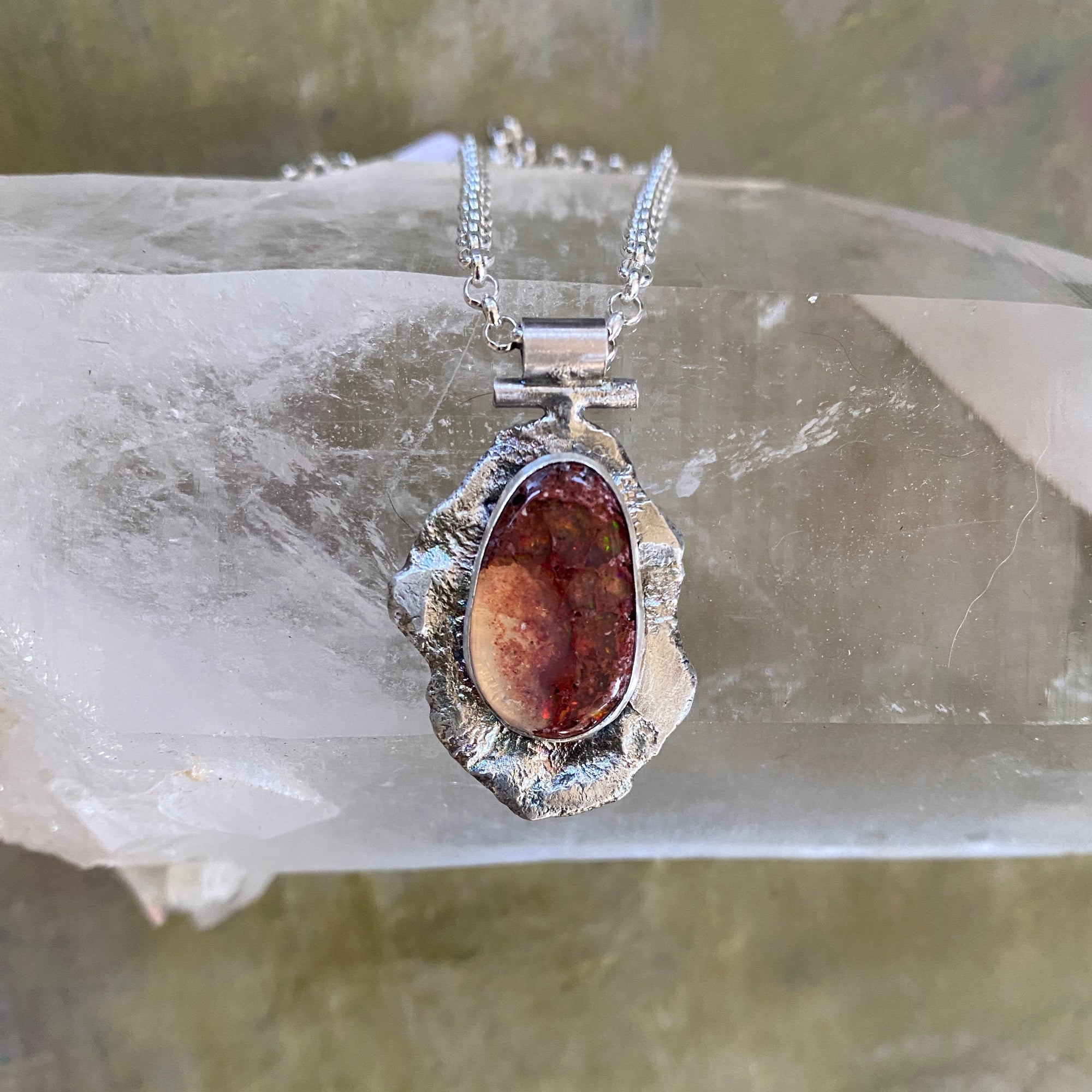 This insane fire Opal reminds me of The Orion Nebula. The colors, the shape, the empty space. Even the silver on the outside of the stone has been created to look like suspended gasses in the universe. Still images do not capture the insane fire of the Opal. Take a peak at this video from my social media page: Nebula Necklace Video
